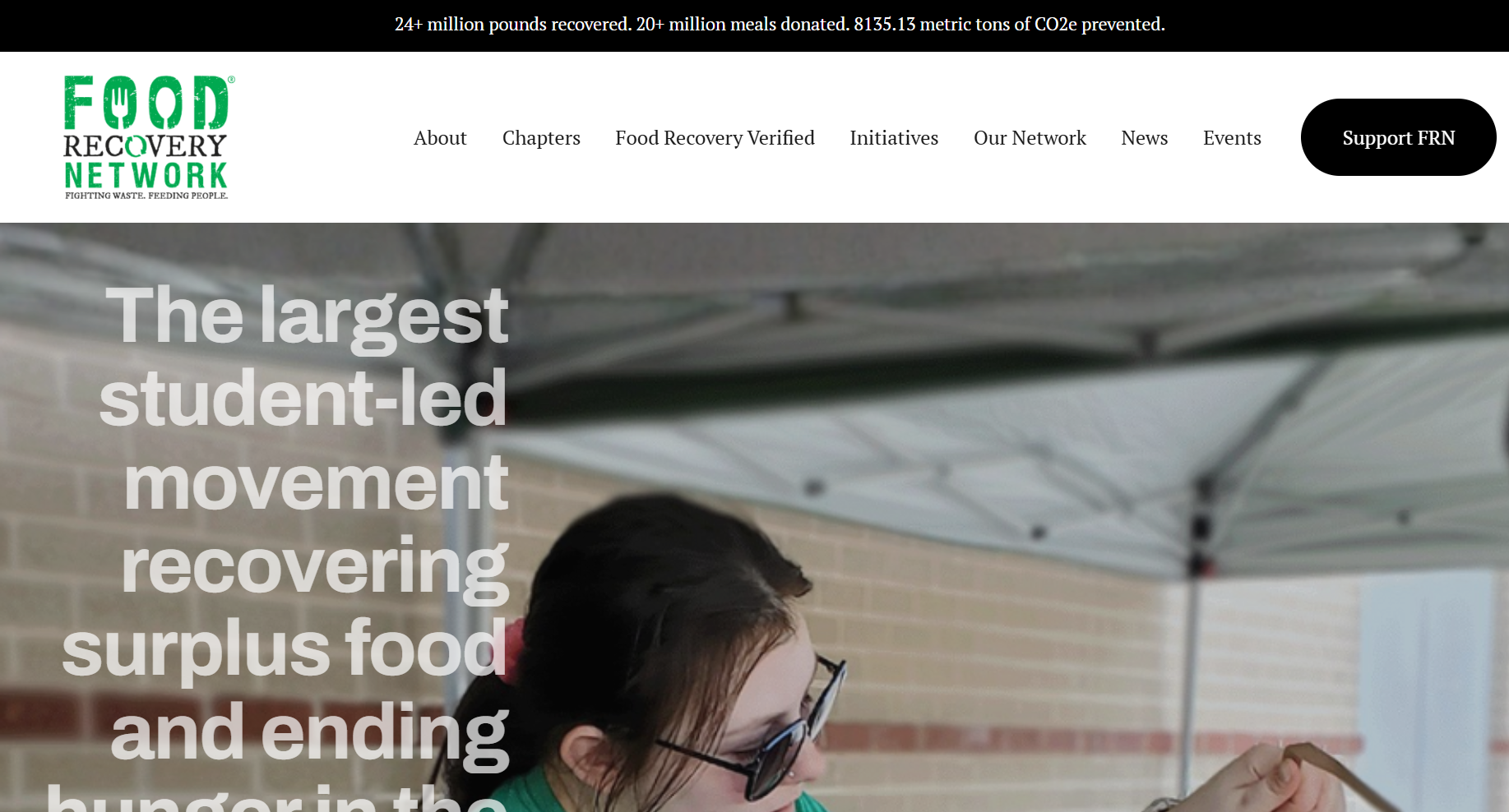 Observation: A banner at the top of the Food Recovery Network homepage highlights cumulative impact metrics including pounds of food recovered, meals donated, and emissions prevented. These figures appear before any narrative description of the organization’s work.